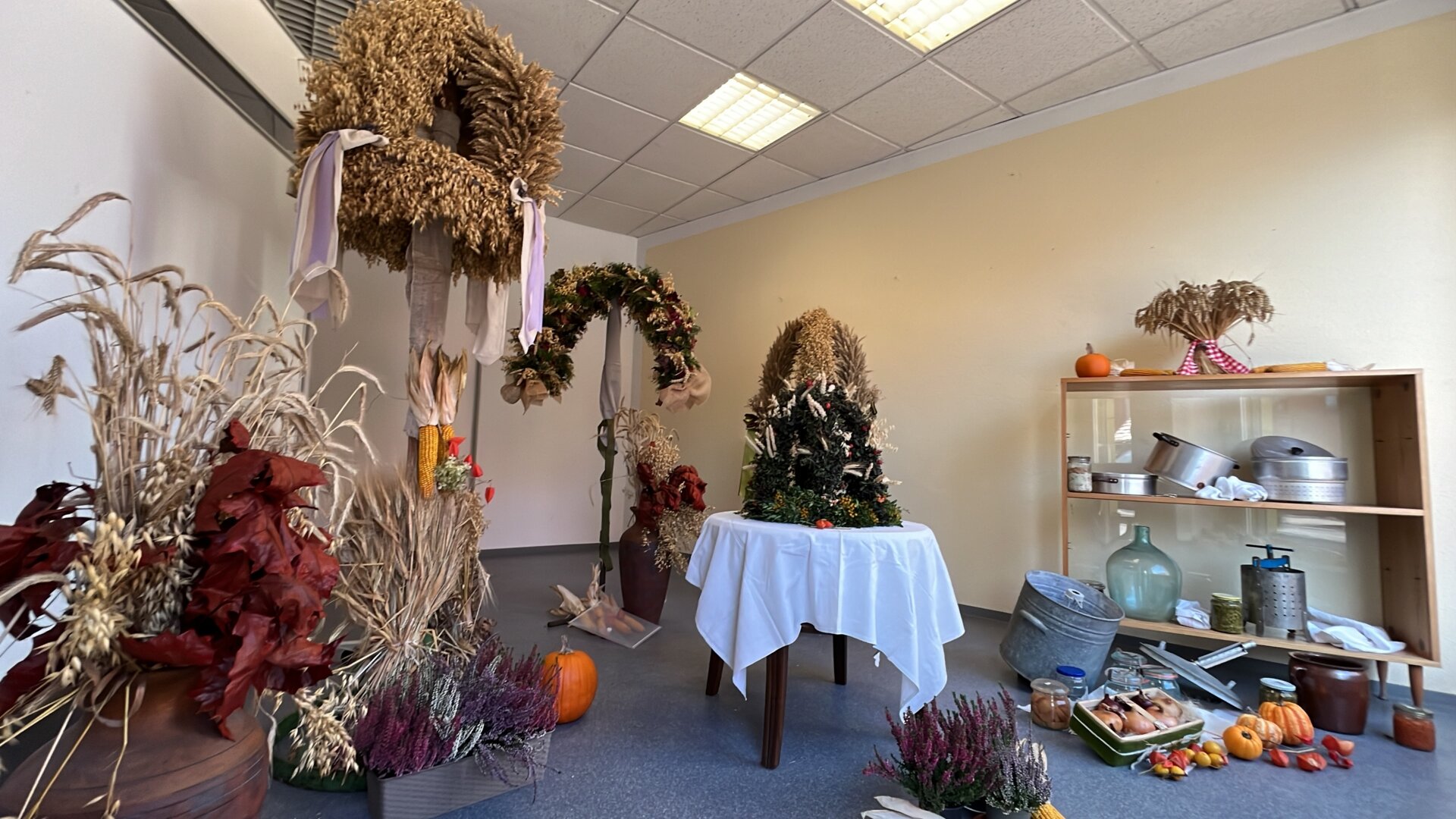 Zu sehen sind die Erntekronen die für die Erntedankgottesdienste und das Kreis-Erntefest 2022 des Landkreises Oberspreewald-Lausitz in Muckwar gebunden wurden.